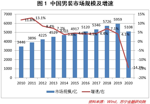 我国的服装行业是一个充分竞争的市场,经过多年的发展,已经较为成熟,男装市场也不例外。近年来,我国男装市场稳步增长(见图1),市场规模由2010年的3446亿上升至2019年的近6000亿,复合年均增速为6.3%,是仅次于女装的第二大赛道;2020年,受疫情影响,男装市场规模大幅下降14%。