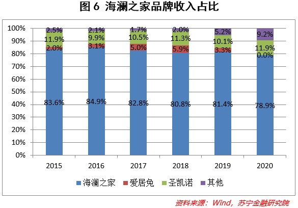 从“男人的衣柜”向打造“全家人的衣柜”转型,海澜之家已经不再满足于男装市场,旗下品类扩展至女装、童装、家居等方面,进行多元化布局,已经摆脱了品牌单一的困境(见图6)。女装如OVV,童装如英氏婴童、家居如海澜精选、职业装如圣凯诺等,均已具有一定的市场知名度。