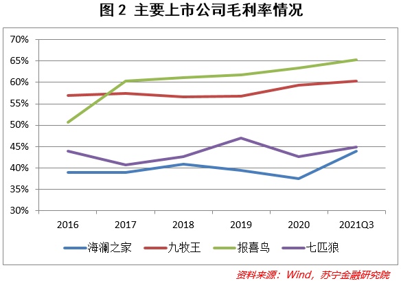 当前,主打男装的A股上市企业主要包括:海澜之家、九牧王(601566,股吧)、报喜鸟(002154,股吧)、七匹狼(002029,股吧)等。从上市公司公布的财报来看,我国男装品牌的毛利率水平较高(见图2),其中海澜之家处于一定劣势,明显低于报喜鸟和九牧王,这或许与海澜之家独特的经营模式有关。