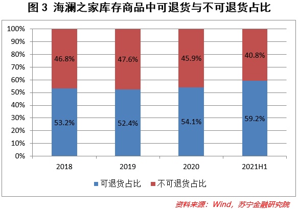 海澜之家零售品牌的产品直接向供应商采购,以“可退货为主、不可退货为辅”的模式进行采购。所谓可退货模式,就是公司与供应商签订合约,如果相应产品在24个月的适销季内没有卖出,公司可按照成本价将产品退还给供应商,由供应商承担相应风险,而海澜之家不用计提跌价准备。由此可见(见图3),海澜之家有一半以上的库存商品有保底协议,大大降低了库存去化、资金回转的难度。