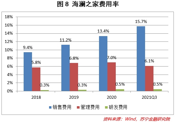 知名品牌的并购并不代表万事大吉,要想持续获得消费者的认可,必须要有能够吸引消费者眼球的新品面世。但从海澜之家的费用情况来看(见图8),销售费用逐年递增,在2021年前三个季度已经达到营收规模的15.7%,而研发费用却连0.5%都没有。这或许是近几年,消费者认为海澜之家品质下滑的一个原因吧。对比来看,森马服饰(002563,股吧)、太平鸟(603877,股吧)的研发费用率分别是2.1%和1.5%,均远超海澜之家。重营销、轻研发是服装行业的共性,但海澜之家似乎过于极致,营销可以带来流量,却不一定能够转化为存量,要想提升客户粘性,新品才是最核心的竞争力。