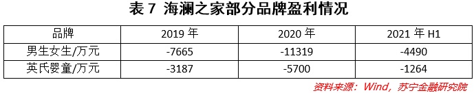 从其他品牌营收占比来看(见图6),虽然年轻消费者的收入贡献越来越大,但仍未超过10%。通过收购其他品牌,确实实现了快速的扩张和市场局面的打开。但是从结果来看,能否成为公司的核心竞争力仍未可知。2019年至今,男生女生品牌、英氏婴童品牌连年亏损(见表7),不仅没有成为中坚力量,反而拖累了公司整体的盈利能力。