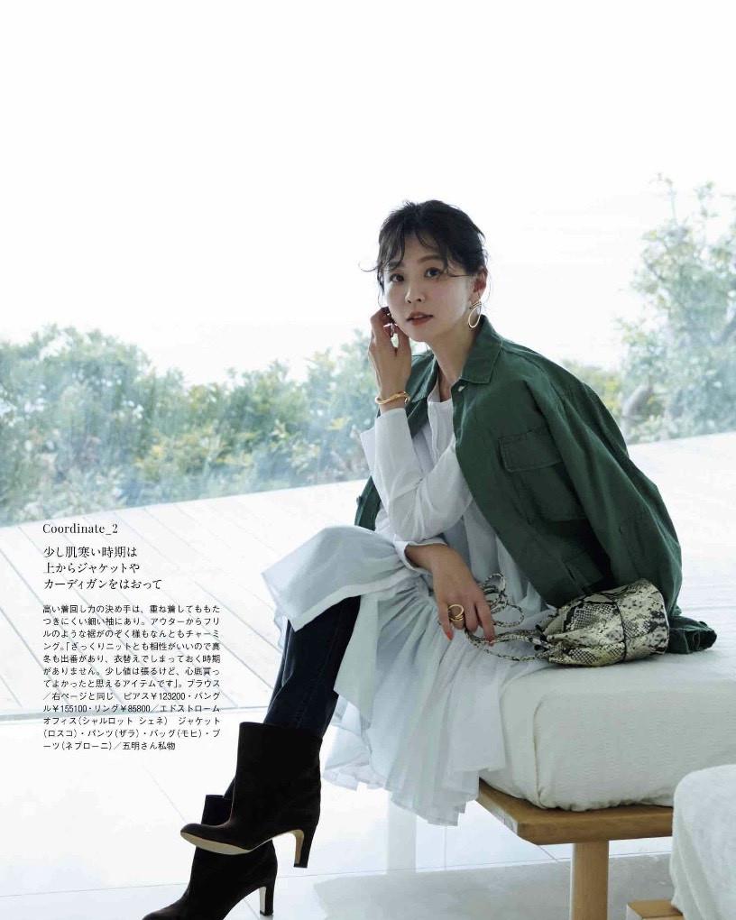 小衬衫翻领的外套,干脆从版型上就延续衬衫的款式,面料选择挺括厚实一些的,内搭轻薄的裙装,在休闲感和甜美感之间做了中和。