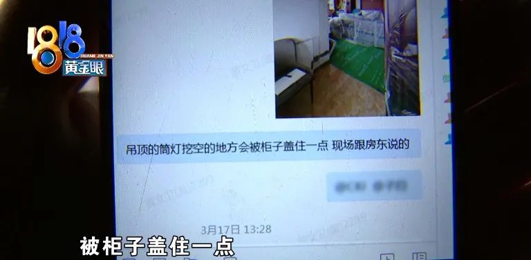 程女士说,房间原来的吊顶上装了两个筒灯,这次装修过程中,对方没说过要拆,现在衣柜装好之后,把筒灯遮住了一半,非常不美观。