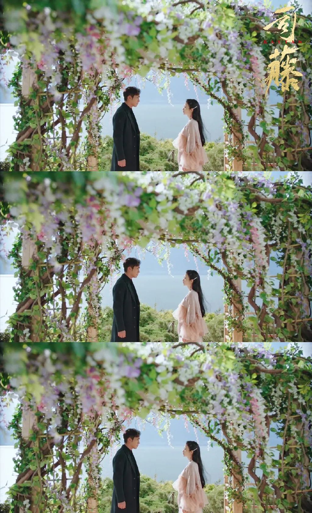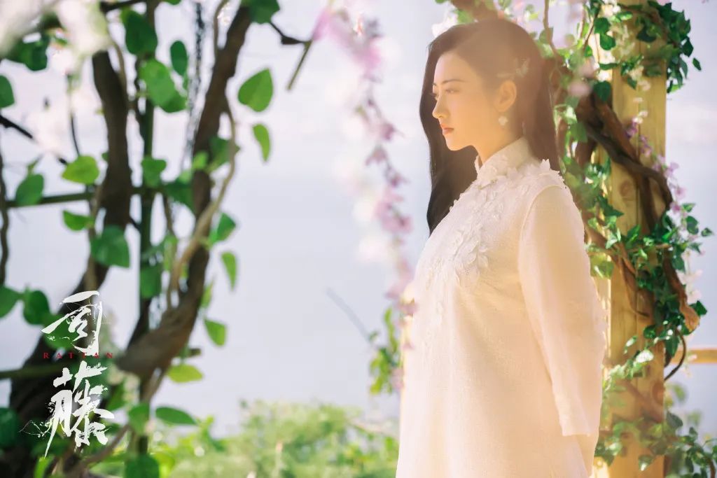 纯白襟袍与粉花绿藤相配,极为浪漫。