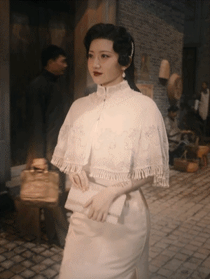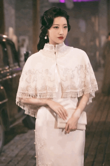 司藤小姐开场的第一套造型就是这套珍珠白真丝旗袍(搭配流苏小坎肩),摇曳生姿地走入大家的视线。