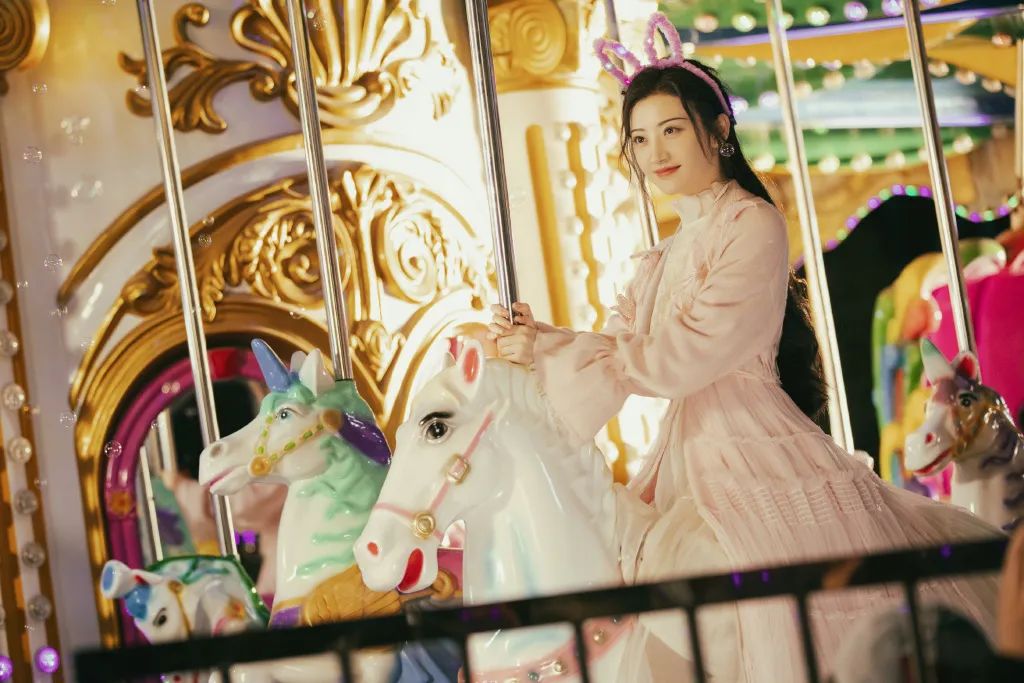 和秦放在游乐园的司藤更是穿得少女感十足——粉纱裙、粉色外搭针织衫以及公主风高领内搭,想必是一场圆满的约会~