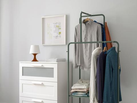 只穿过一两次还不打算清洗的衣裤,怎么说都不适合放进衣柜里,但是随手挂在椅子上或放在床上,没几天就堆得跟小山一样了。避免这类衣物堆积又能暂时披挂的方式,一座轻便的衣帽架不可或缺!NIKKEBY吊衣杆不但可悬挂衣物,还有层板设计,就连组装用的螺丝也能当作挂钩,用来收纳手提包、围巾和外套等,瞬间让你的卧室恢复整齐清洁。