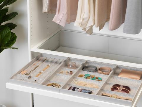 用来搭配服装的手表、太阳眼镜、领带、戒指、项链……,老是东一个西一个,不然就是纠结在一起,这时候你需要运用有间隔设计的收纳盒。KOMPLEMENT 隔层储物格让每个配件都有各自专属的位置,所有东西一目了然,大大节省翻找时间。更棒的是,这个收纳盘底部还附有绒布软垫,保护表面不刮伤;同时也有多种规格可选,上下堆叠也没问题!