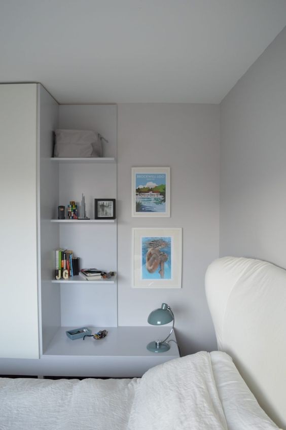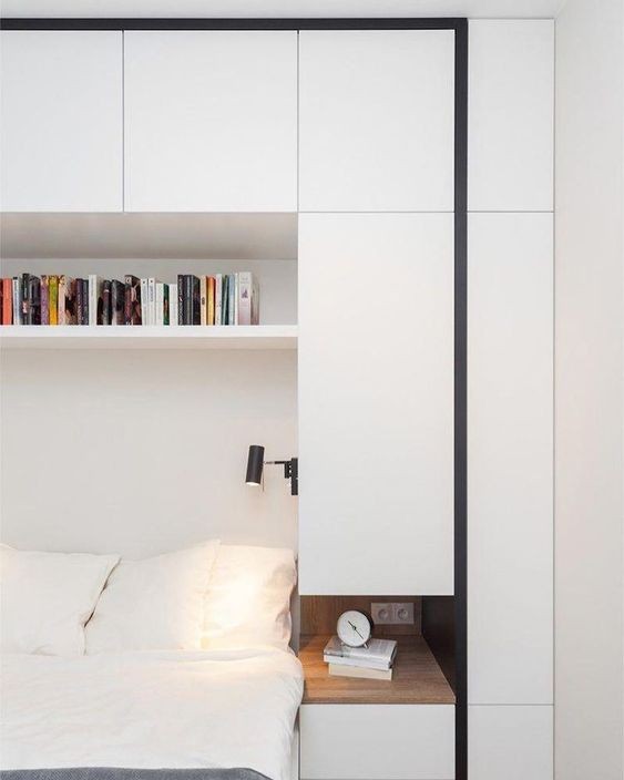 或者是打柜子特意延伸一块悬空板至床头这里,床头收纳不也就有了!