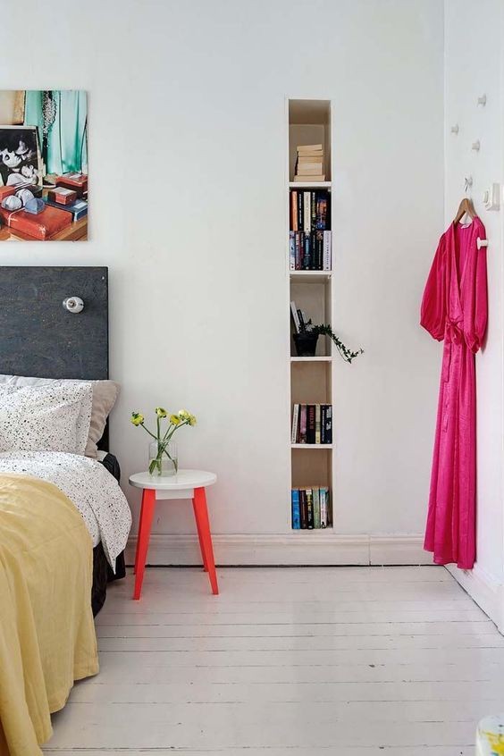不过也并不是家家都在卧室装内嵌式柜子的,所以不需要床头柜也能满足置物的办法还有很多,看看哪个适合你们家吧: