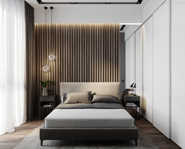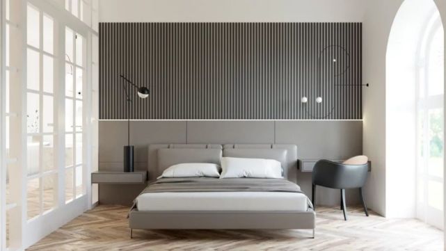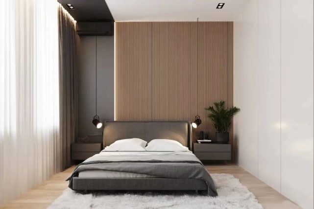 卧室的隐形衣柜一般同其他的部分连在一起,比如衣柜可以和卧室的背景墙相连,将整面背景墙都打造成衣柜,然后将把手完美隐藏起来。