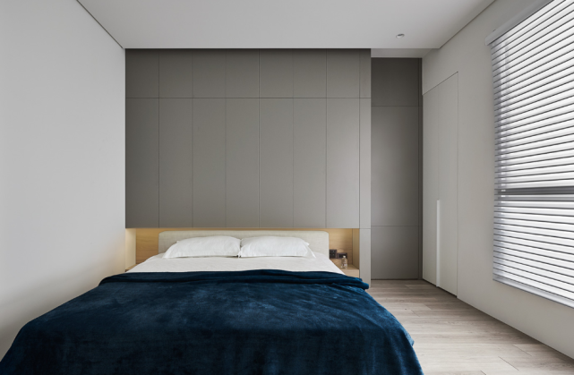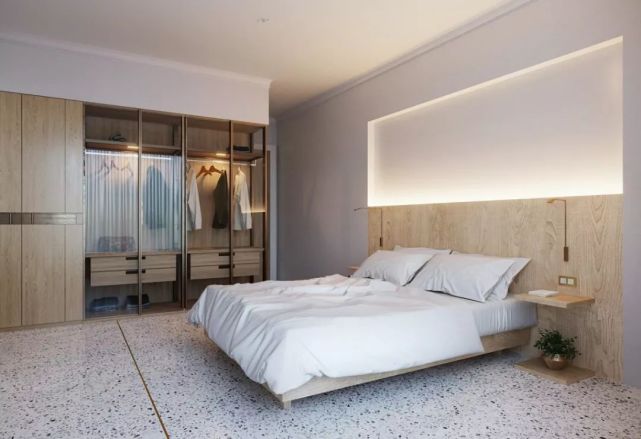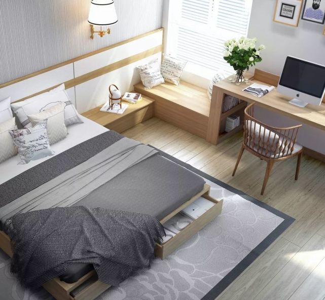 那么不妨试试一体化的床+床头柜+衣柜,能够最大化的利用卧室的小角落,而且也免去了很多卫生死角,让休息区更为干净整洁通透。