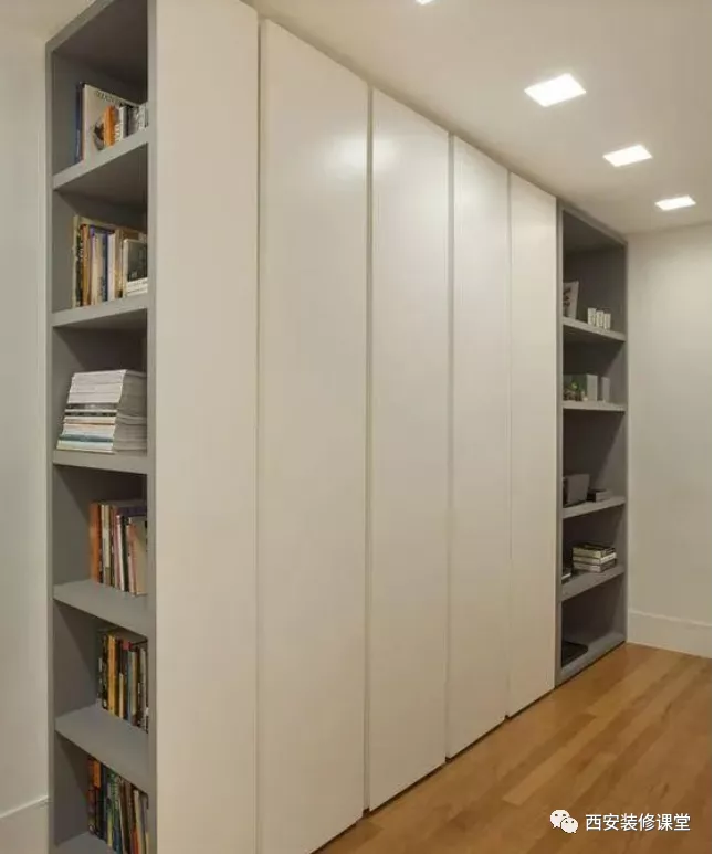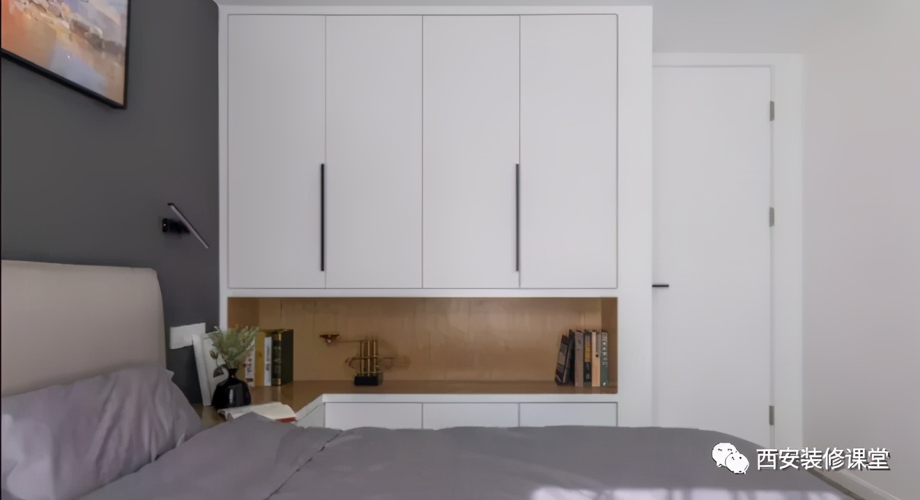 第三种,侧面镂空收纳,相较于见光板和假墙,这个比较有功能性,而且造价一分钱不会增加,可以满足卧室小件物品的随手放置,也可以直接作为书架使用。但是并不会减弱柜体的存在感,只不过是变换一个形式,来解决侧面材质以及接缝问题。
