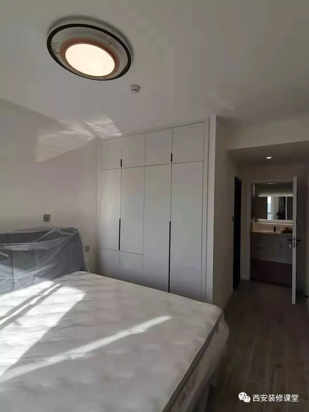 第二种,做石膏板假墙,相较于见光板,石膏板假墙如果和家里木工一块做的话,成本要低,而且可以最大限度减弱柜体的存在感,比见光板要实惠多了