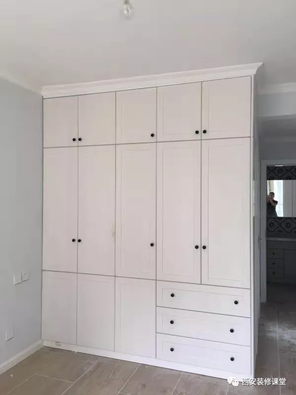 ▲做中央空调,刚好利用吊顶压低空间;或者不做中央空调,采用吊顶压低空间,只要满足2.4米的高度,国产板材即可满足通柜的条件。这里好多人认为做吊顶费钱,其实是个误区,吊顶有了,假墙有了,衣柜自然就小了,定制费用要比吊顶贵多了,所以这样做的好处反而节省费用而且还满足了通柜。