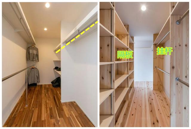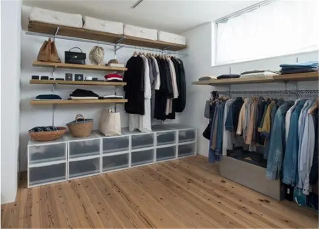 也有不少日本家庭完全是自己安装隔板和挂杆设计衣帽间,这样能让布局更自由,灵活度也高,自己买隔板组装好就能用,比定制柜子成本低多了,能节省不少开支。