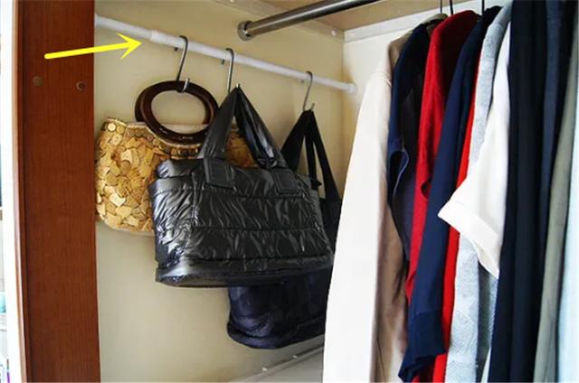 内侧墙面也可用伸缩杆拓展出悬挂区,日常用的包包、手提袋统统都能放在这里,不浪费丝毫空间。