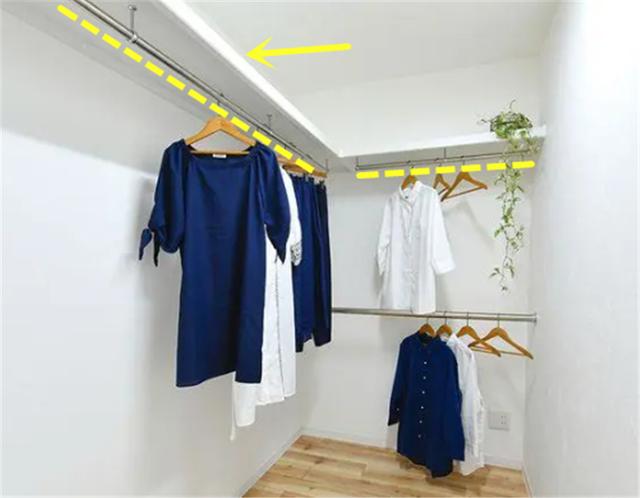 不像我们会在衣帽间内定制衣柜,日本人的衣帽间设计更倾向于简洁化,用隔板和挂衣杆组合就是衣柜。这样一来,既不会让室内显压抑,又能从视觉上让空间明亮开阔。