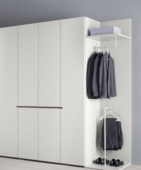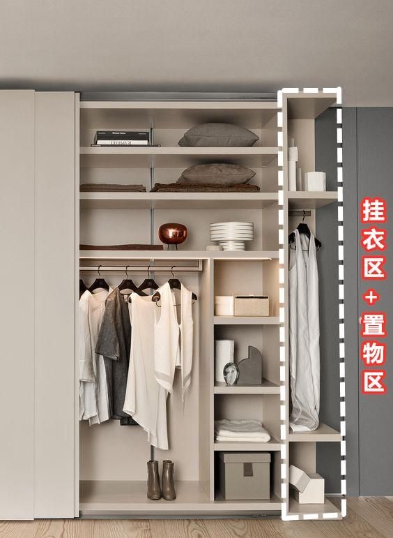 衣柜侧边单独留个空,改成挂衣区,除了一些常用的外衣、睡衣等,都能挂在这儿,拿取便利,最上层改成封闭式柜子也无不可。