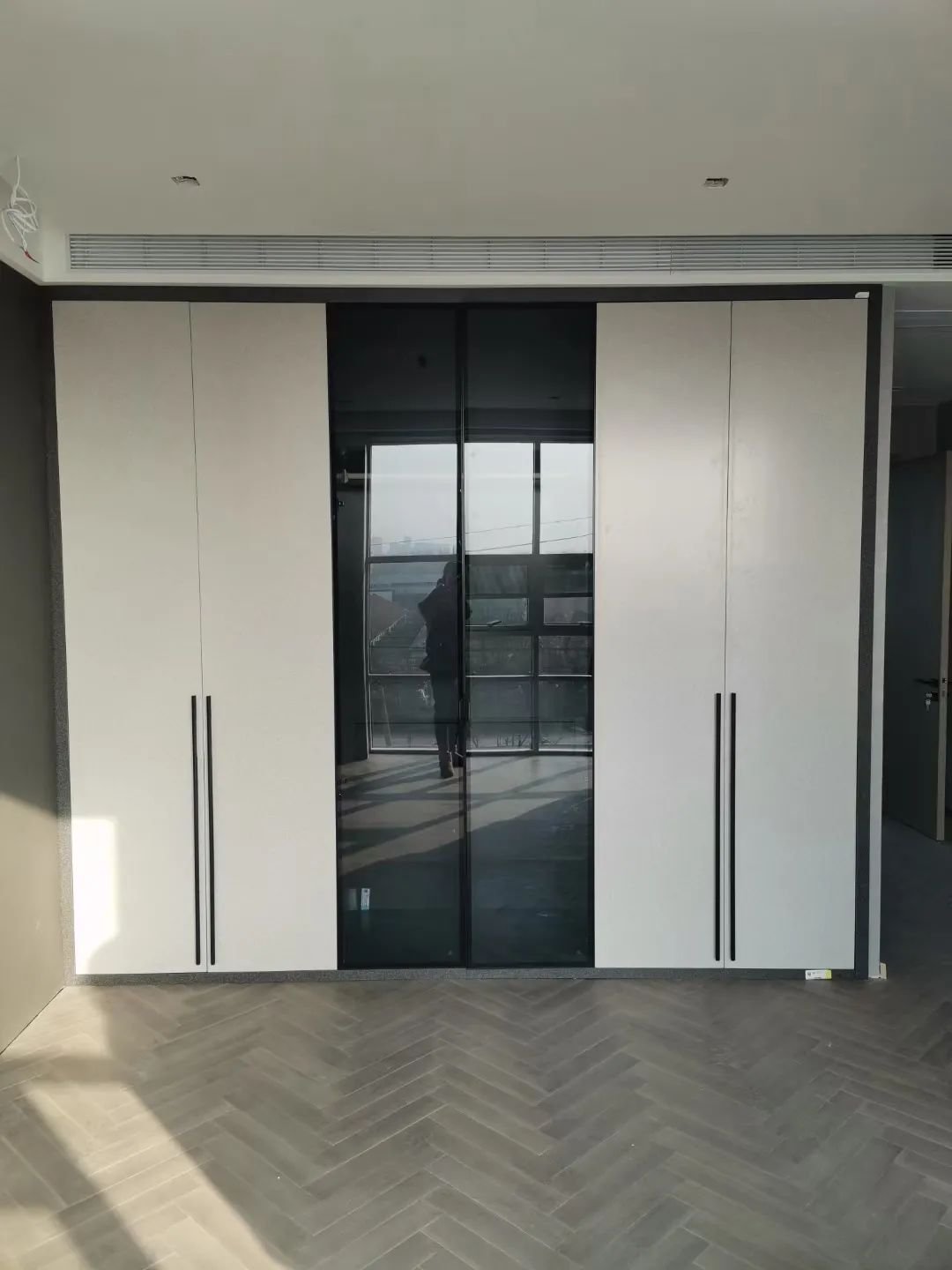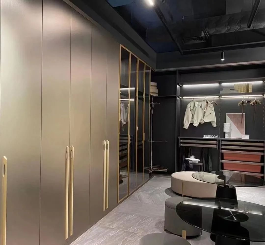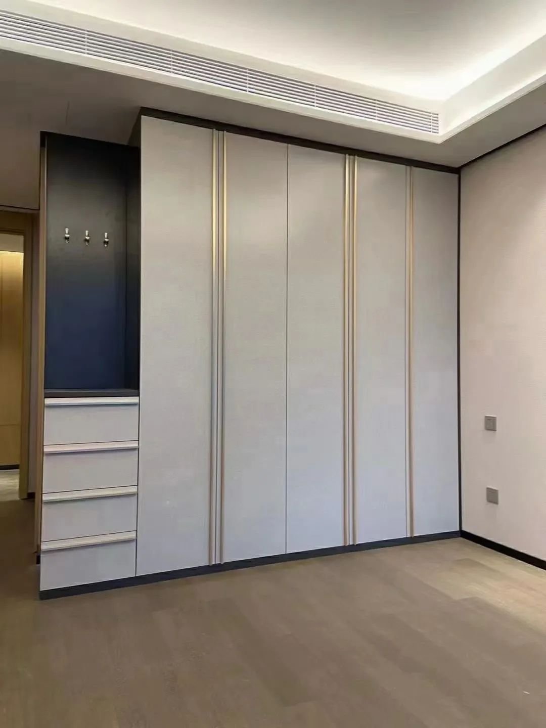 到顶的衣柜,提升了空间开阔感,更时尚潮流。再加上长拉手的搭配,空间开阔感更提升了。