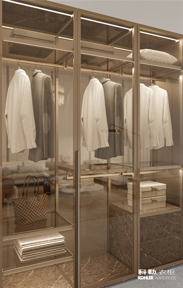 在外光芒万丈的你,家中的每一件家具,墙上的每一幅画,桌上的一杯一勺,一定也映射着你独有的审美与品味,身上的衣帽鞋包更不必说。科勒衣柜晶至系列,通体采用金色透明玻璃,搭配科勒特制的罗曼铜色边框及品格高贵的大理石纹柜体,大胆奢华却又现代感十足的混搭风格,让科勒定制衣柜如同一座璀璨城堡,散发浓浓的艺术气质。金色玻璃似水晶般通透明亮,让珍爱的衣服不必再藏于漆黑一片,而是在晶至衣柜的关照下,尽绽光芒。