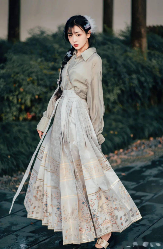 若是素色的马面裙呢,用白衬衣搭配起来,就更加像常服了,也是绝对没有违和感的哦。