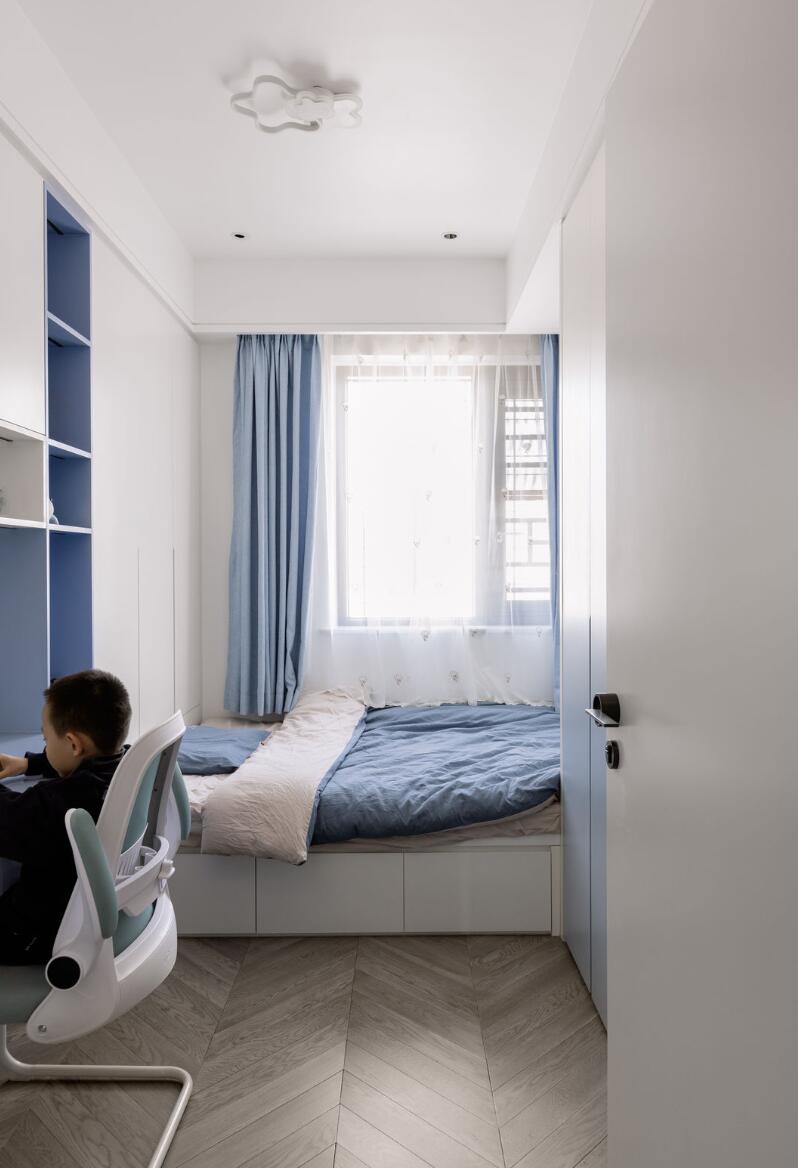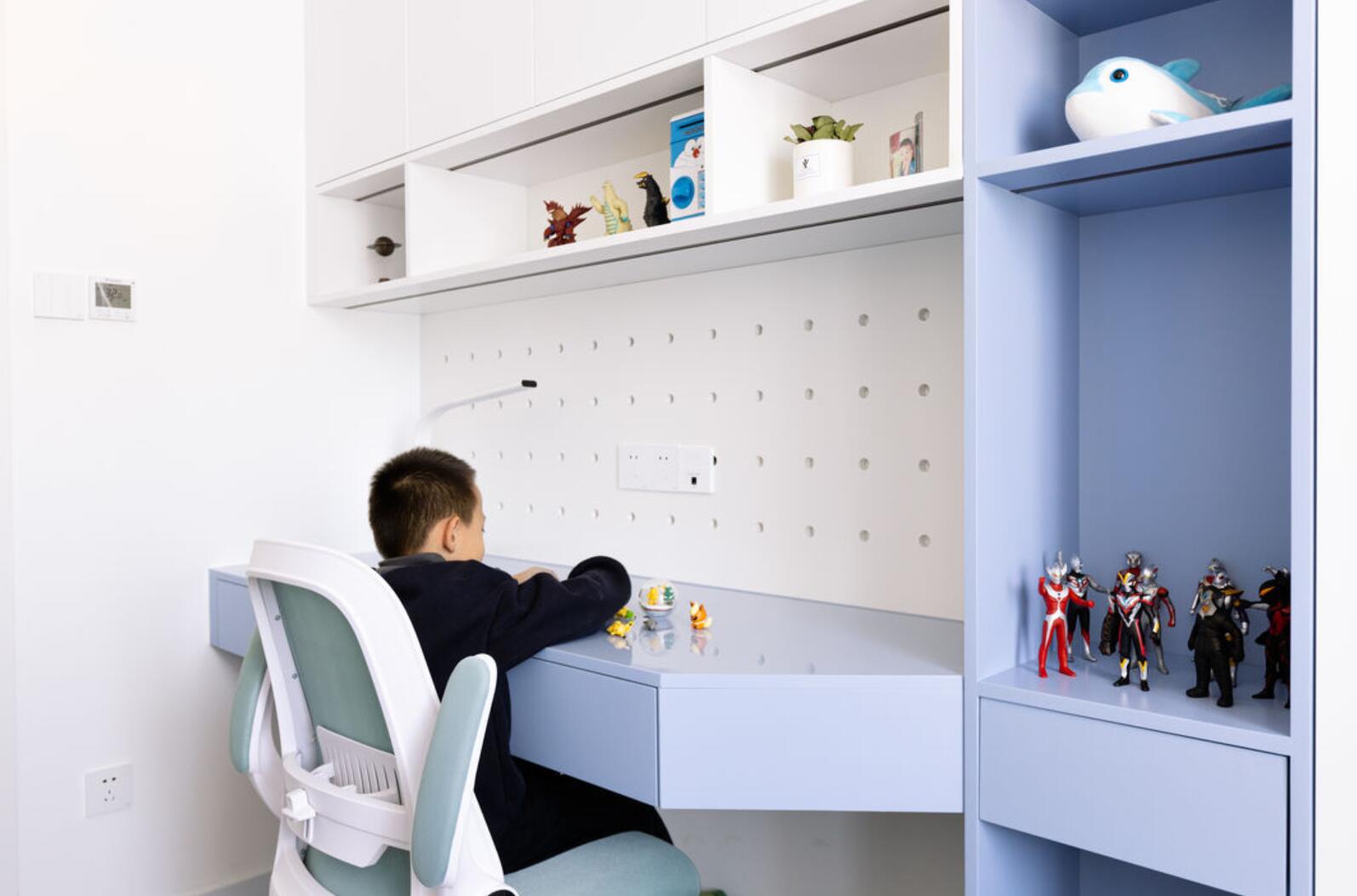 男孩房以经典的蓝白调为主,活泼中不失舒缓,且非常符合孩子的喜好。而储物功能规划这块,同样将空间完全利用上了。比如侧面与榻榻米上面的衣柜配置,书房上面的书架配置,甚至书架下面的墙面,也用洞洞板装饰上了。
