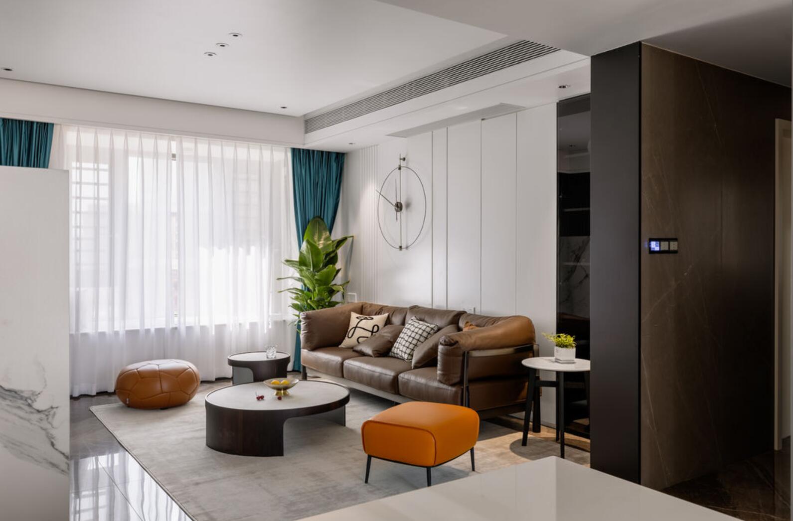 沙发背景墙采用柜体加硬包来设计,在丰富空间的前提下,又不失实用性。而选择一字形的沙发,搭配几个沙发凳来配置,既保留了一定的活动空间,也方便了两个孩子玩耍。