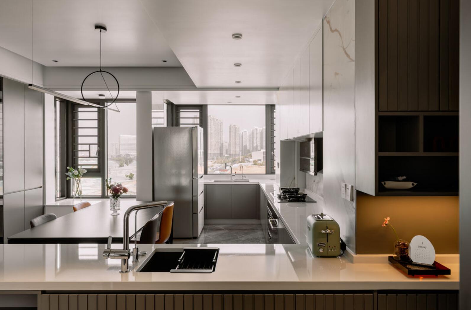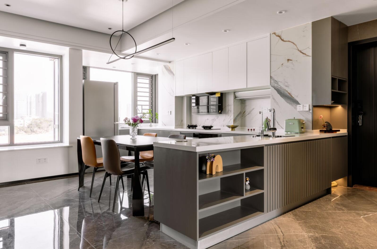 餐桌与吧台齐平并纵向摆放,让整个厨房差不多形成了围合式布局,这样不仅提高了空间的使用率,也拉近了家人之间的距离。比如孩子在餐厅或者客厅活动时,屋主哪怕在厨房也能一眼看到,从而方便了交流。