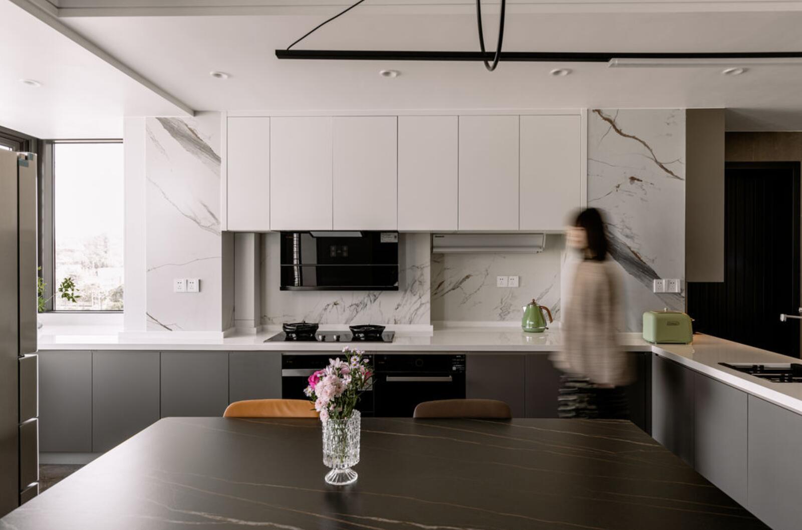 橱柜采用灰白色来搭配,干净又利落;岩石板饰面的餐桌,则尽显质感,看起来很有品味。当然,该餐桌的存在,也为厨房延伸出了一定的操作功能,非常方便。