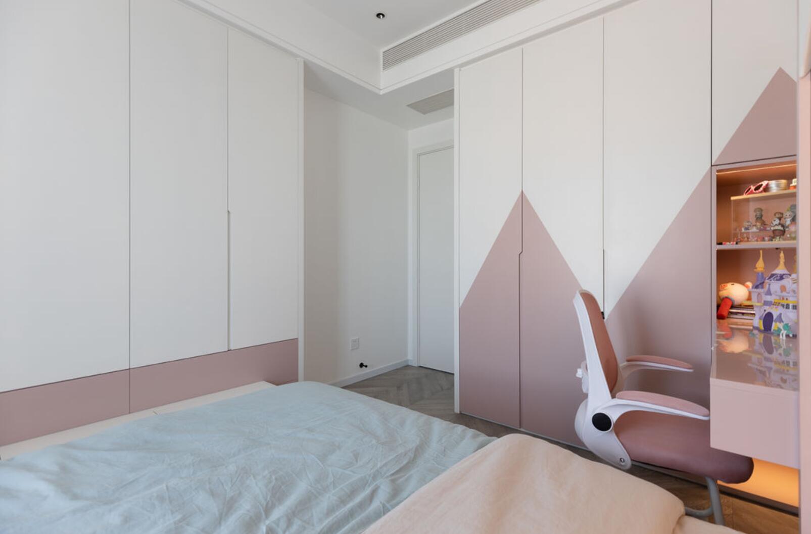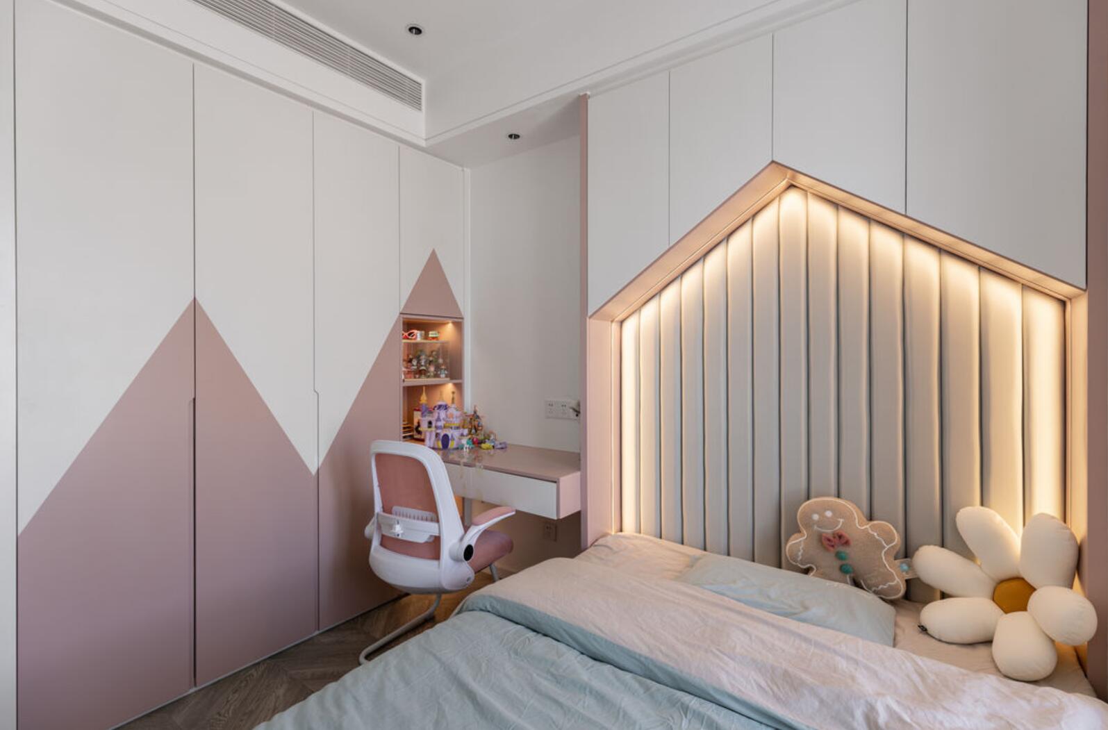 女儿房以灰白为基调,营造出了浪漫、梦幻般的空间氛围;床头的软包造型以及灯光配置,则又凸显出了空间的活力。而在空间布局这块,除了榻榻米本身强大的收纳功能之外,同样配置了双面衣柜。