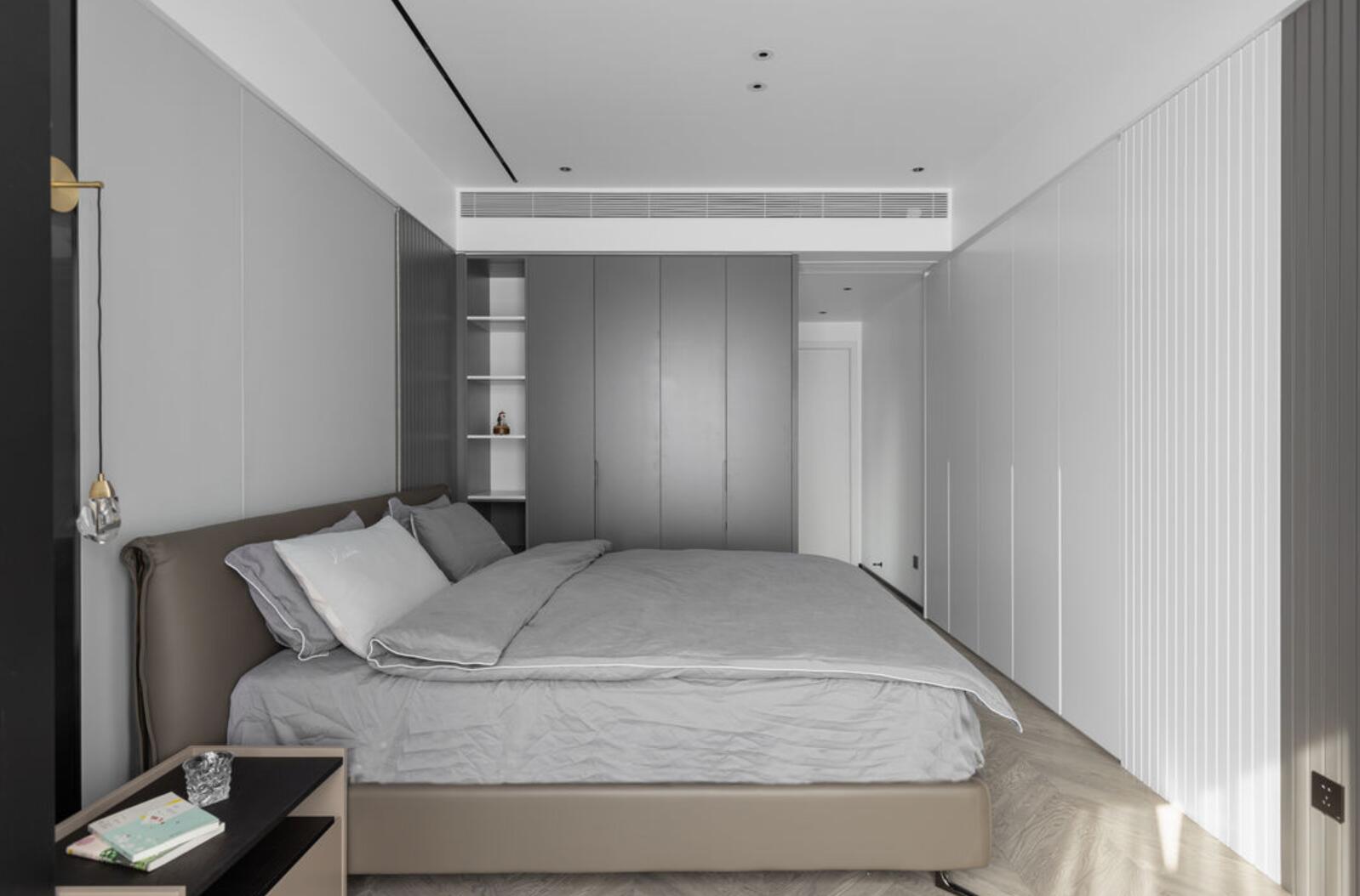 主卧最大的亮点,还是双面衣柜设计。转角处的衣柜以灰色饰面为主,可以与床头背景墙融为一体;电视墙处的一组内嵌式衣柜以白色为主,则凸显出了简洁干净。同时,为了弱化两组衣柜所带来的拥挤性,床头对面的墙体,还做了凹凸造型设计,非常巧妙。