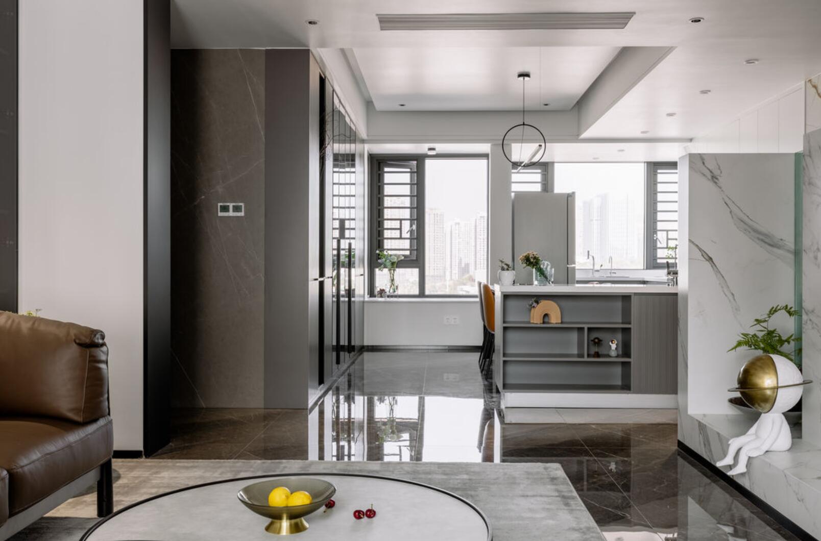 客厅看向餐厨区视角,空间明亮,动线合理,且十分的宽敞,没有一点拥挤感。