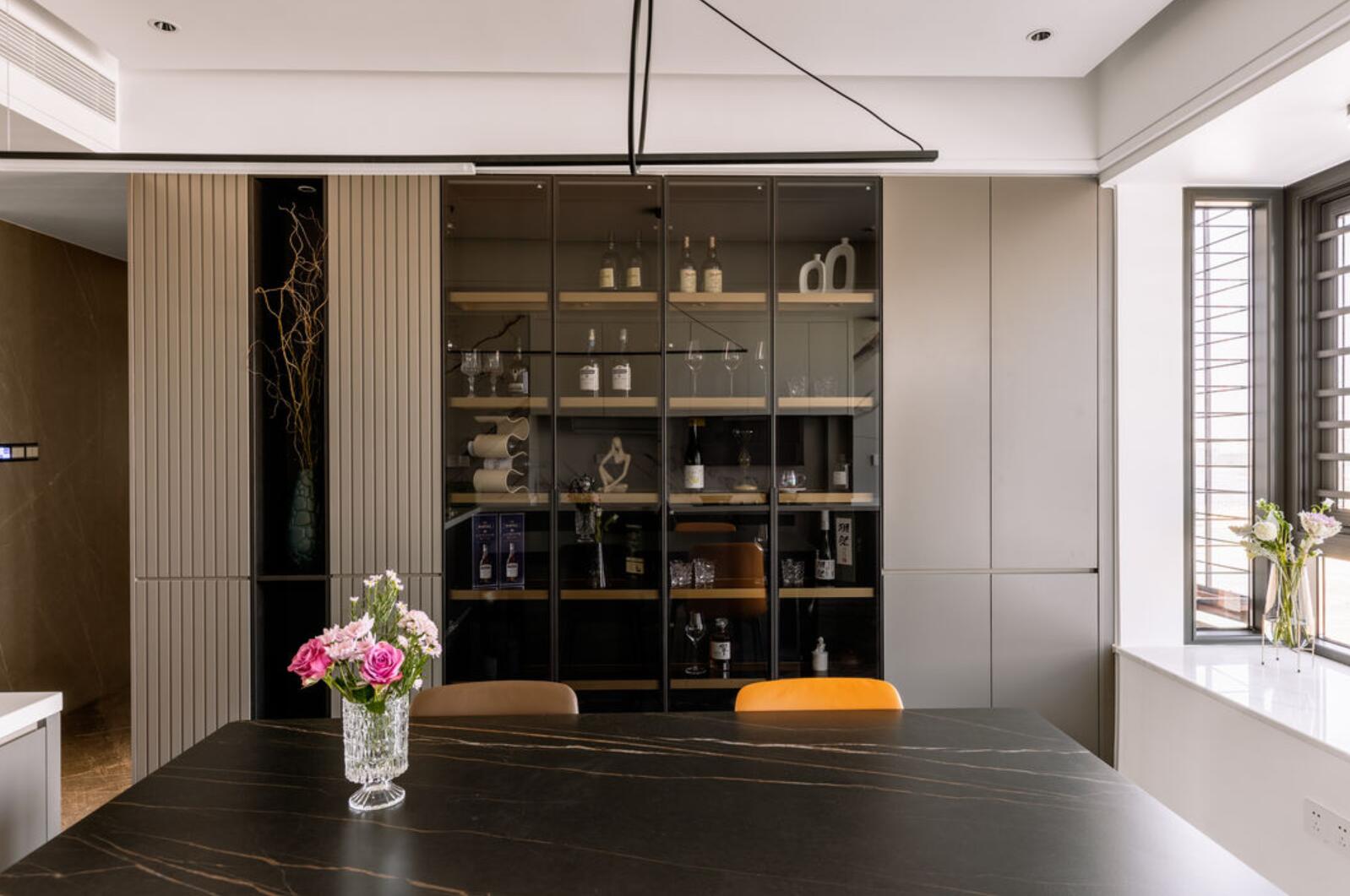 餐厅另一面设计了一组4米宽的酒柜,两边做封闭式,中间做成灰色玻璃门,既有了不错的展示,也方便了杂物的收纳。不过考虑到左边的柜体,位于入户第一视角,所以就给门板做了凹凸造型,并在中间做了端景台,从而起到美化视觉的作用。