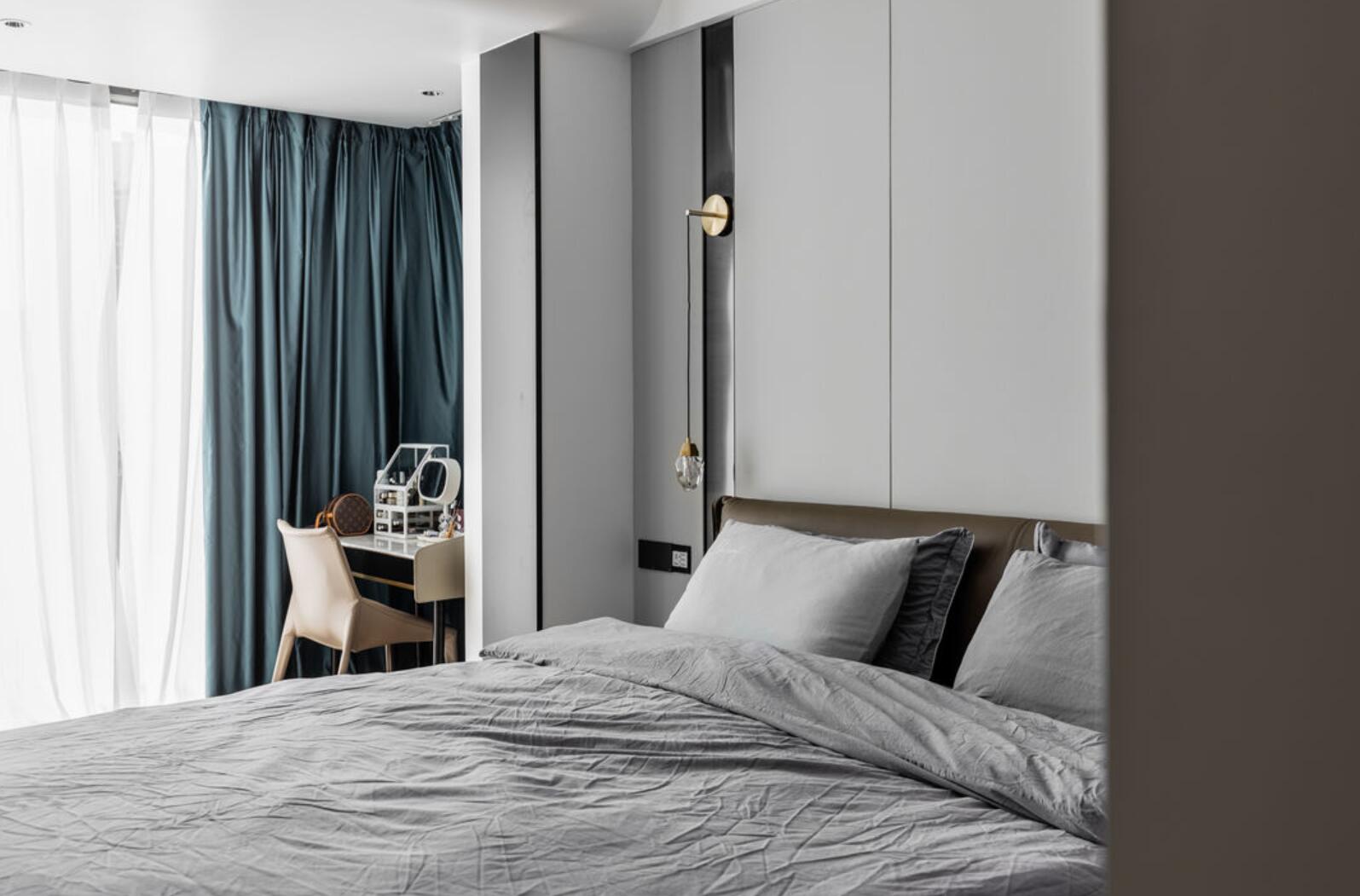 主卧床头再次使用到了硬包材质,在丰富空间层次的情况下,也透露出了极强的质感。整体以灰色调为主,则为屋主夫妇营造出静谧、淡雅的空间氛围,从而与室外做到动静分离。而外面的阳台,则延伸出一块梳妆区,解决了女主的日常需求。