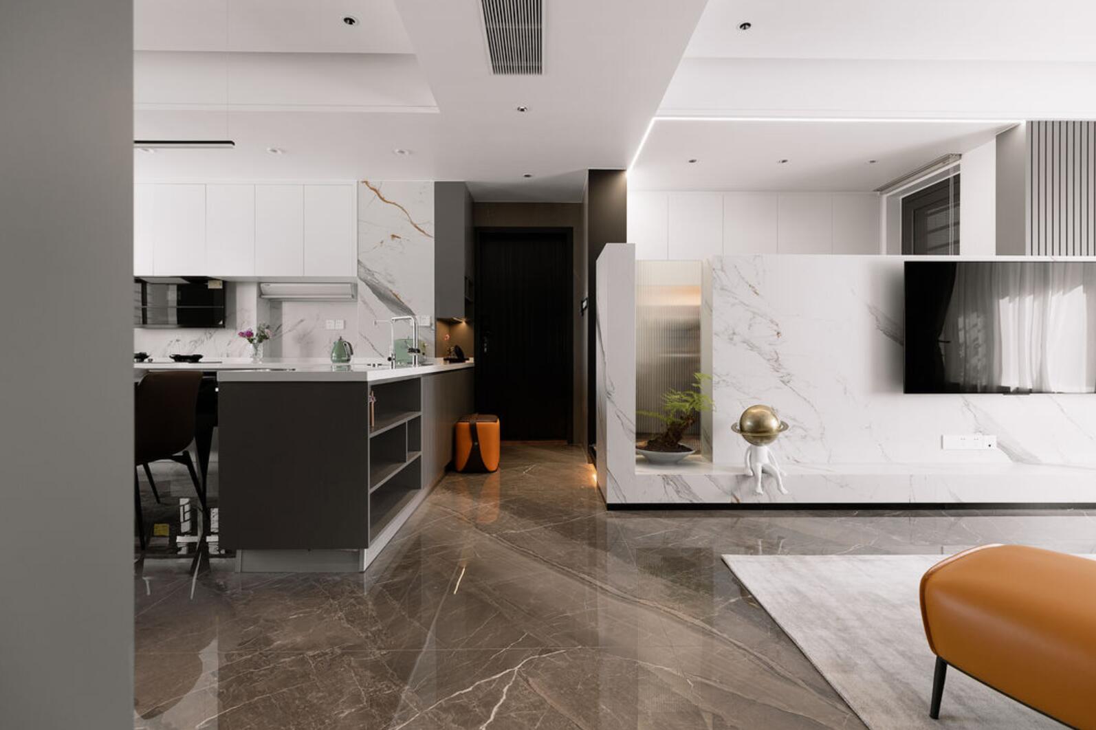 由于厨房墙体打开后,进门就是餐厨区,这样既提高了空间视野感,也让入户有了充足的采光。侧面一组2.7米长的吧台设计,不仅解决了入户收纳需求,有藏有露的开合设计,也兼具了展示功能。同时,入户门旁边吊柜下的灯光配置,也让人进门就有了温馨的氛围感。