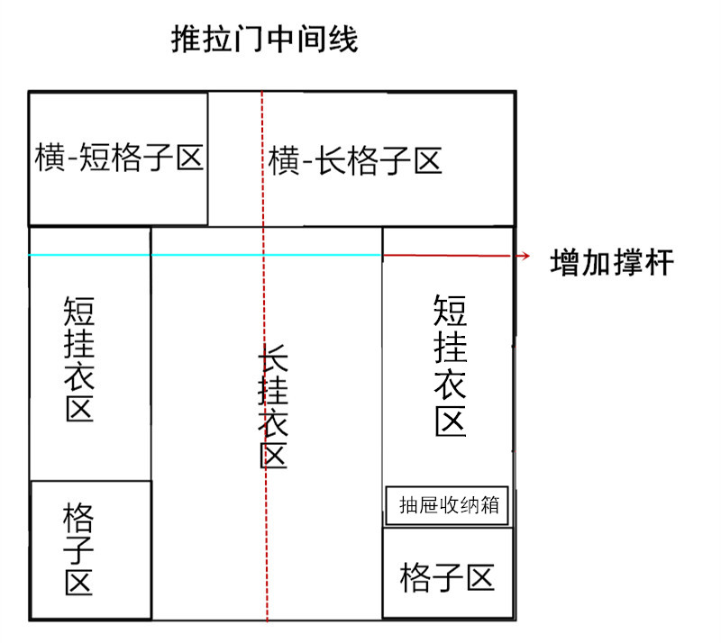 重新改变后的布局增加了短挂衣区,相比多隔板,这种方式明显更合理,不过,可能你还会感觉这个衣柜挂衣区太多了,我们还可以通过下面要讲的抽屉式收纳箱来解决。