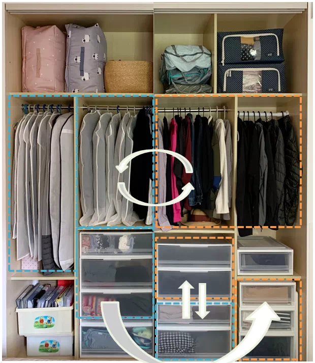 其实也是我们之前经常跟大家提到的,用抽屉式收纳箱来规划挂衣区的布局和收纳量。