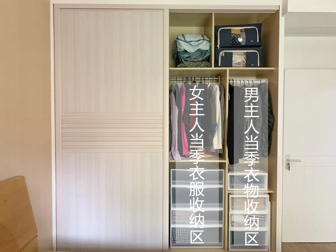 建议不当季的衣服,存放在衣柜拿取不方便的半边,特别是有床头柜的一侧,开门比较费劲,就可以用来放非当季的衣物。