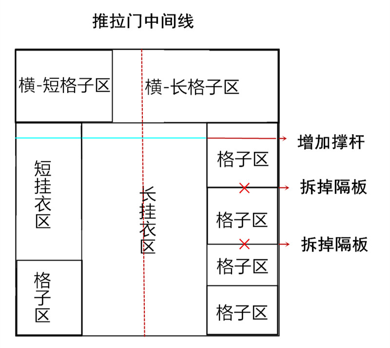 对于这样的衣柜,最好的方法是重新规划空间布局,拆掉隔板。让衣柜的格子,不再被浪费,同时把挂衣区放在了方便拿取的部分。