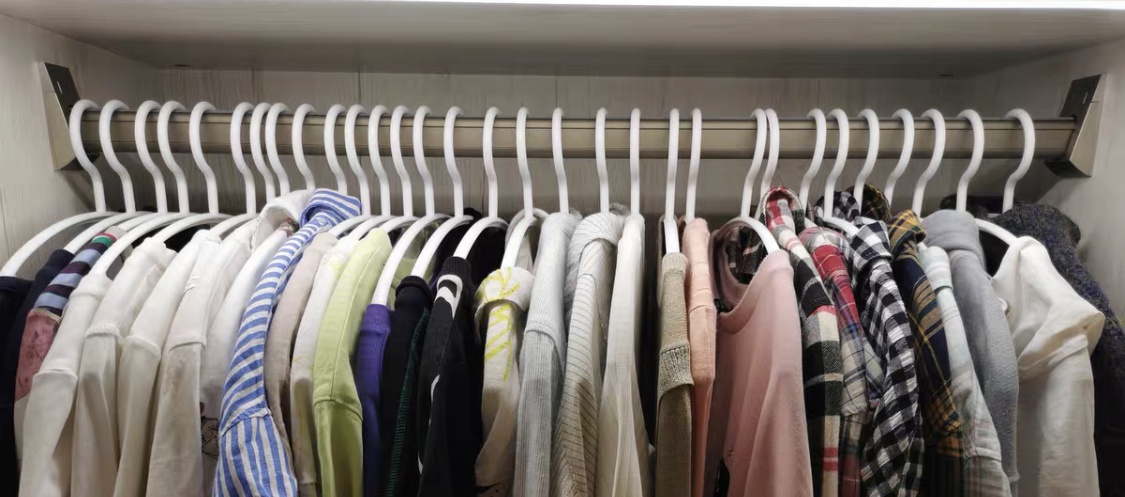 多种不同颜色、款式、厚度的衣架,让原本色彩就比较多的衣服,又带来更多的视觉信息,所以感觉还是乱。而只要换成统一的衣架,效果就会大大改善。
