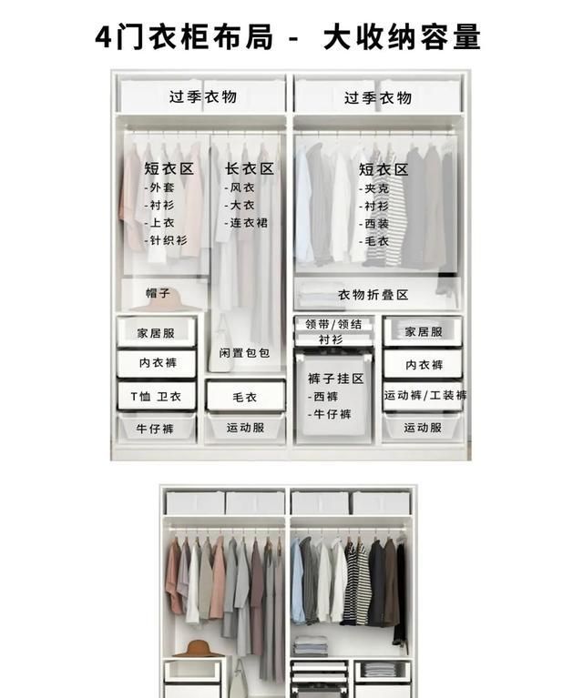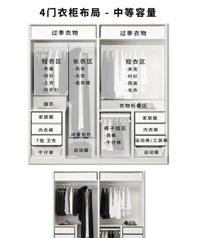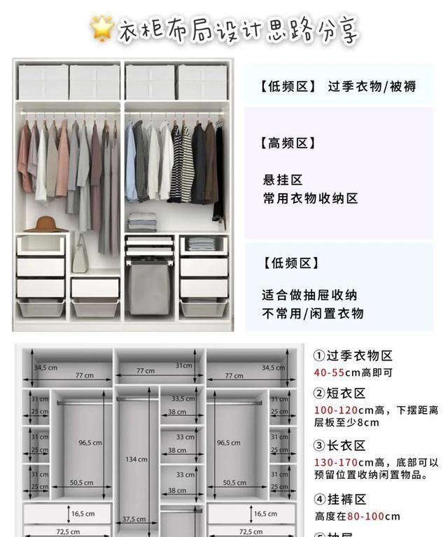 3. 隔板和抽屉都不太适合设置在腰部以上的位置,顶层的过季衣物区除外。