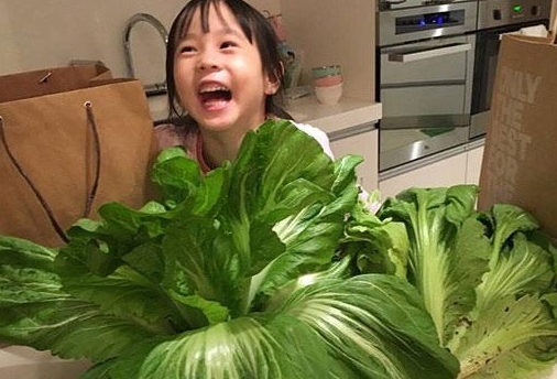 厨房的设计也是非常的大气,白色的橱柜和台面看起来非常的简洁,给人一种很干净大气的感觉,小女儿抱着一颗大白菜开心的笑着。