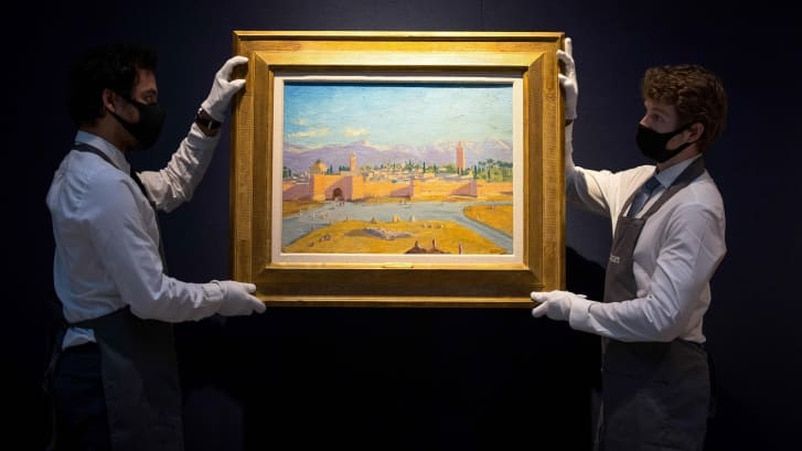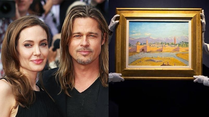 这幅画是英国已故首相邱吉尔(Winston Churchill)的作品《Tower of the Koutoubia Mosque》,早年毕彼特因拍摄昆顿塔伦天奴(Quentin Tarantino)的《希魔撞正杀人狂》(Inglourious Basterds)而对邱吉尔大感兴趣,与朱莉热恋时更与之到访过英国的邱吉尔战报房,当时毕彼特更花295万美元(约人民币1800万)买来送给朱莉,此情已逝,画作升值近3倍,朱莉劲赚一笔。