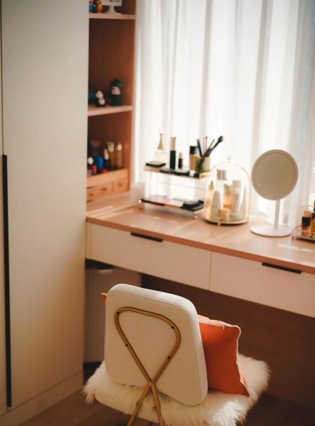 有个梳妆台,连接着一个灯带书架,灯带亮起来很漂亮。