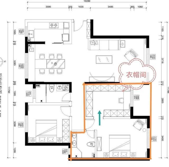 有个大胆的想法,将主卧和相邻的次卧打通,做成衣帽间,这样主卧的活动区域就非常大,功能也会非常全,也会有更大的休息空间。