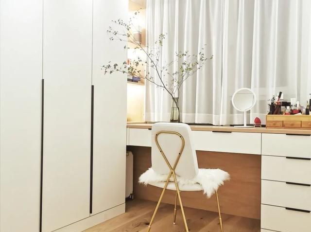 * 其实客卧,大部分是不怎么用的,一年到头可能偶尔会有客人会住家,为了一年的偶尔,还不如每天都使用这个房间利用率高。(当然如果执意想留个偶尔使用的功能,可以做蒹用设计。不建议这个房间就常规的放一张床)基本是一个回字型,利用南面窗户做了梳妆台,书桌,阳光很好。