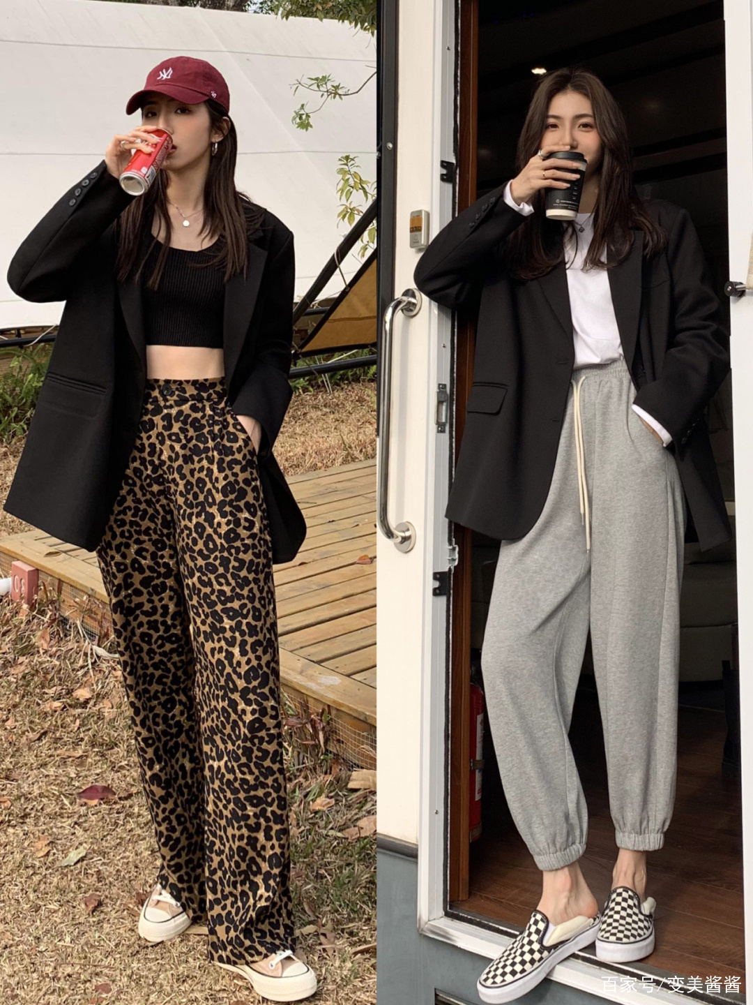 选择西装外套时,尽量挑选款式简约,版型偏大一些,颜色经典的,这种西装外套更有型,也更容易驾驭。黑色西装外套内搭一件黑色的露脐吊带,又酷又飒又有几分性感味道。下身搭配一条高腰款式的豹纹拖地阔腿裤,时尚感倍增,十分抢眼!再来看看右图这套穿搭,黑色西装外套内搭白色上衣,再搭配一条浅灰色的束腿裤,随性又洒脱。