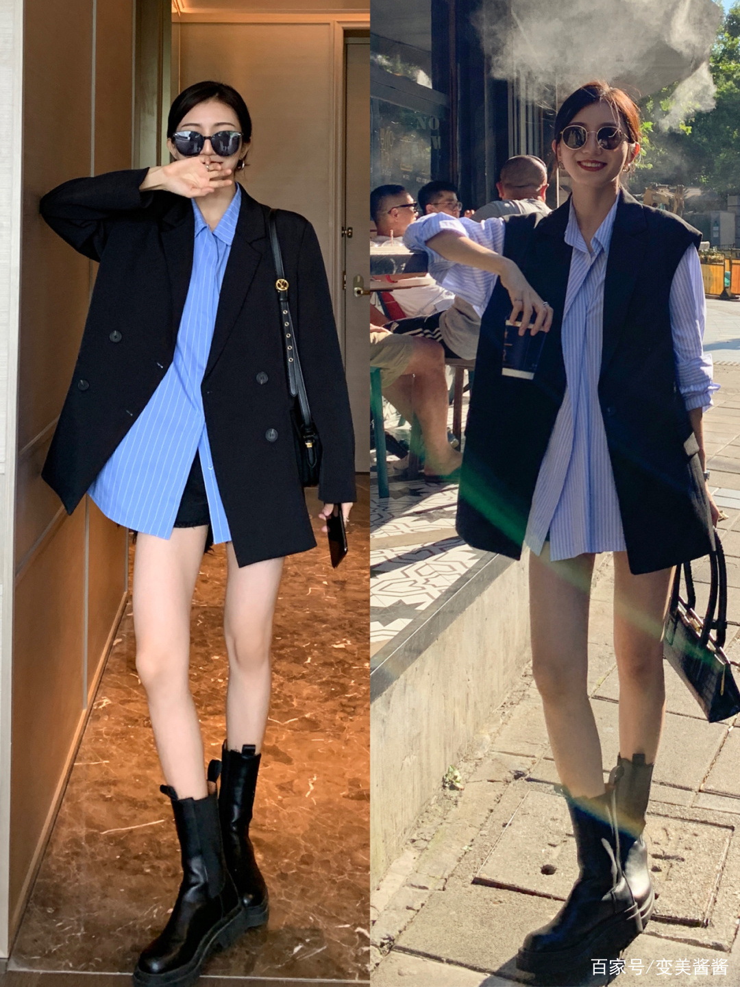 西装搭配衬衫是我们最常见的,像这样的搭配看起来会有些中规中矩,没有新意。所以,我们上半身这样穿的时候,下半身的搭配一定要特别一些。可以像这组搭配,身穿一件黑色西装,内搭浅蓝色的条纹衬衫,气质得体又不失时尚感,下身再搭配一条黑色短裤,配上黑色短靴,下衣失踪的穿法太过于时髦洋气!穿腻了常规款式的西装外套,也可以偶尔尝尝鲜,像这样,选择一件黑色西装马甲,更显得个性,再搭配上蓝色条纹衬衫,既能提升时尚氛围又能够彰显气质感。